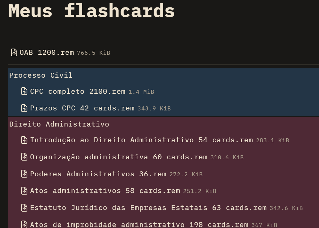 Com base nas aulas da sanfran (direito USP), ministradas por professores de excelência, e em materiais direcionados a estudos para concurso, desenvolvi os flashcards diretamente no RemNote. O material possui vários decks, alguns foram feitos a partir de listas de questões para concursos específicos. Assim, consigo revisar o que mais tem sido cobrado naquelas provas. No meu instagram @direitobyamanda, eu mostro melhor como desenvolvo os flashcards, quais já estão disponíveis e quais estão em andamento.